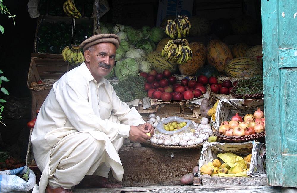 Lächelner Hunza-Händler in seinem kleinen Obstladen