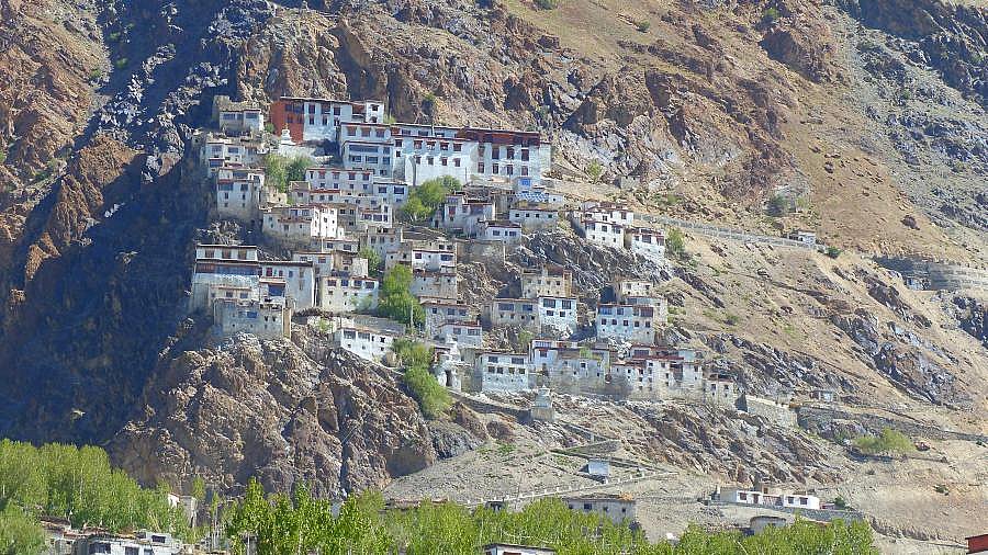 Stufenförmig angeordnet liegen die verschiedenen Gebäude des Karsha Klosters übereinander