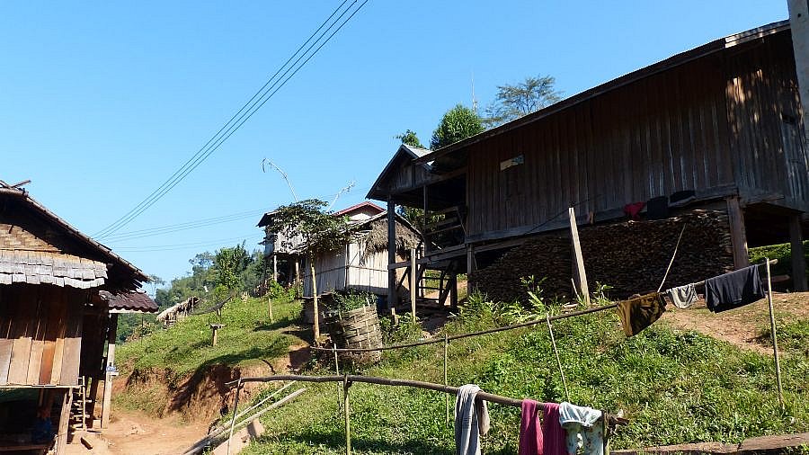 Einige hundert Meter von der Straße entfernt besuchen wir ein Dorf des Volksstammes der Khmu. Die Häuser sind sehr einfach - teilweise aus Holz, teilweise aus Strohmatten.